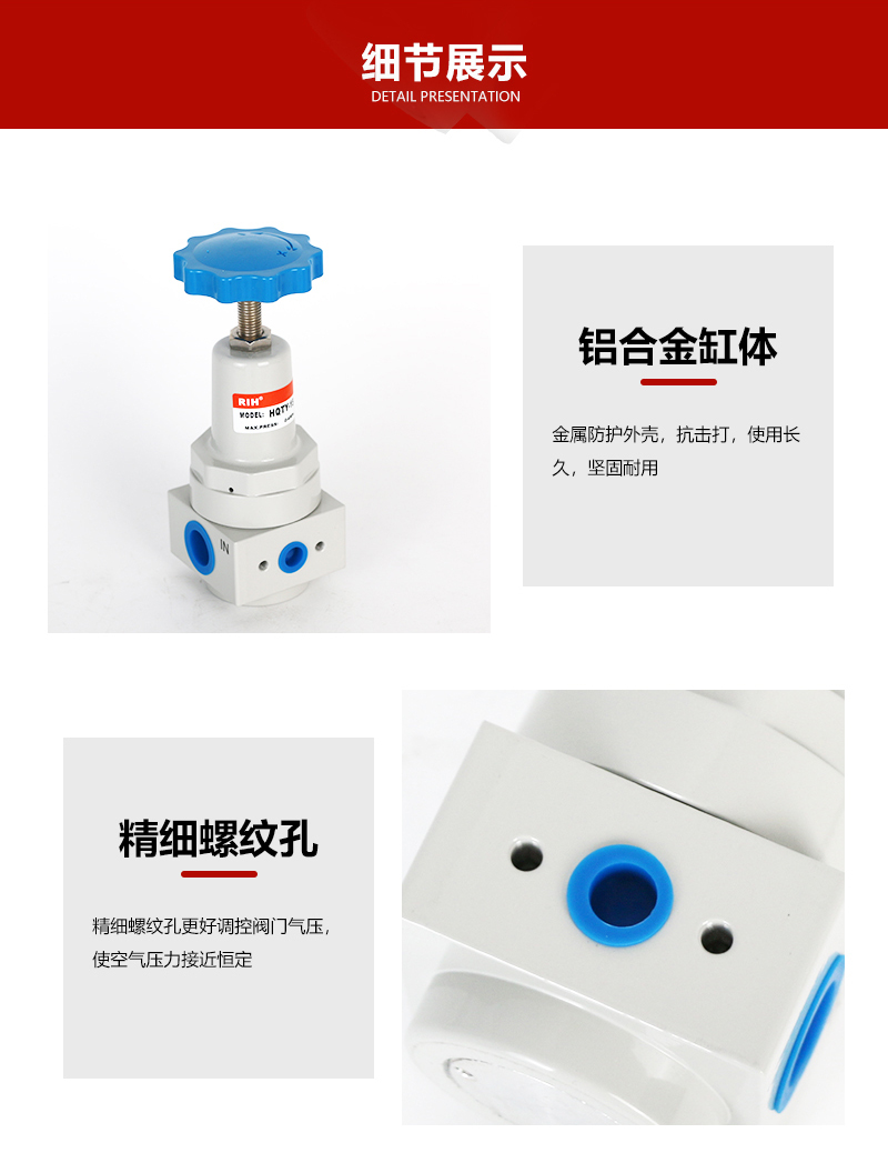 減壓閥是氣動(dòng)調(diào)節(jié)閥的一個(gè)必備配件,主要作用是將氣源的壓力減壓并穩(wěn)定到一個(gè)定值,以便于調(diào)節(jié)閥能夠獲得穩(wěn)定的氣源動(dòng)力用于調(diào)節(jié)控制。HQTY高壓減壓閥適合0.1~4.0Mpa環(huán)境下使用,外表緊湊堅(jiān)固。1、為了操作和維護(hù)方便,該閥一般直立安裝在水平管道上。2、安裝時(shí)應(yīng)注意使管路中介質(zhì)的流向與閥休上所示箭頭的方向一致。瑞亨氣動(dòng)提供最全面HQTY高壓減壓閥選型報(bào)價(jià)及銷售。